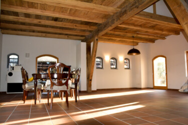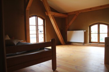 Unser Haus ist neu: eine wieder aufgebaute Remise im Herzen der Uckermark, bestens geeignet für konzentrierte Seminararbeit, für tiefe Entspannung und hohe Feste!! Eine Kombination aus modernem Neubau und historischem Gebäude mit großem Kaminofen und wohl temperiertem Raumklima dank Fußbodenheizung. Der kleine Saal im Erdgeschoss ist technisch gut ausgestattet und bietet Raum für ca. 40 Personen. Im Obergschoss bieten drei Mansarden über Nacht Platz für 6 Personen. Viel Raum zum Selbergestalten von Festen, Meetings und Freundestreffen mit kleiner integrierter Küche sowie weiteren Übernachtungsmöglichkeiten im Ort. Wir sind haustier- und rauchfrei.